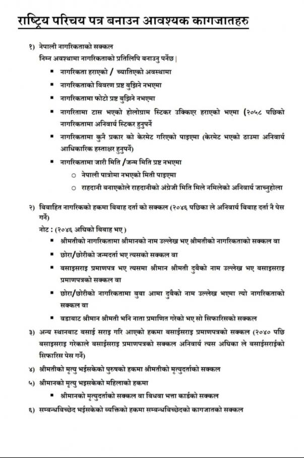 राष्ट्रिय परिचयपत्र वनाउन चाहिने आवश्यक कागजात सम्बन्धी जानकारीकाे लागि