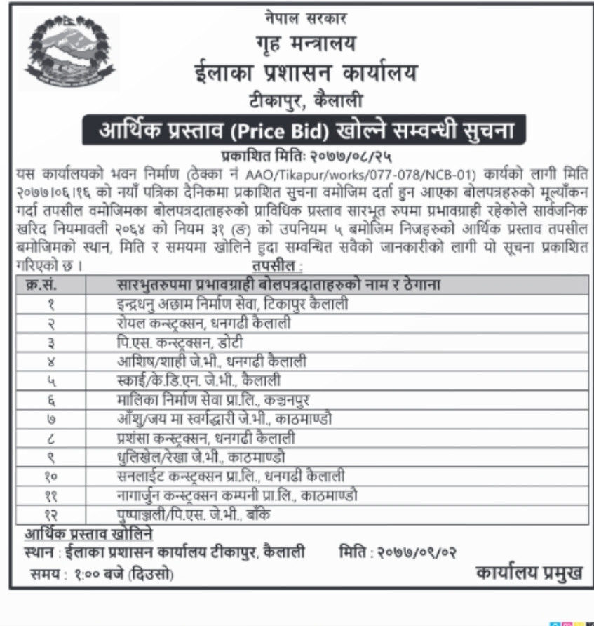 अा र्थिक प्रस्ताव खाेल्ने सम्वन्धी सूचना