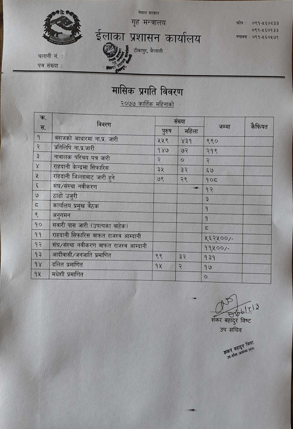 २०७७ सालको कार्तिक महिनाको प्रगति विवरण