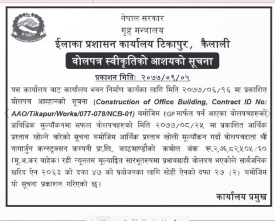 वाेलपत्र स्वीकृत गर्ने आसयकाे सूचना